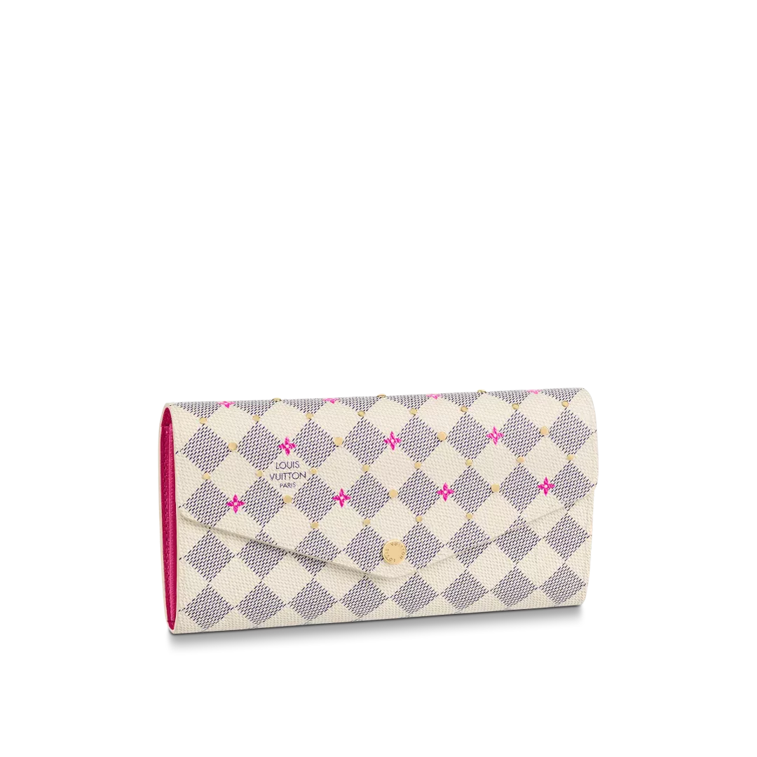“Portefeuille Sala” reinterpreted for a special edition of the “Damie Azul Studs” collection. Damie Azul canvas with fuchsia pink floral motif print and delicate gold-colored studs. The enveloped wallet, which opens and closes with a snap button engraved with “Louis Vuitton”, is also practical, multifunctional and easy to organize.