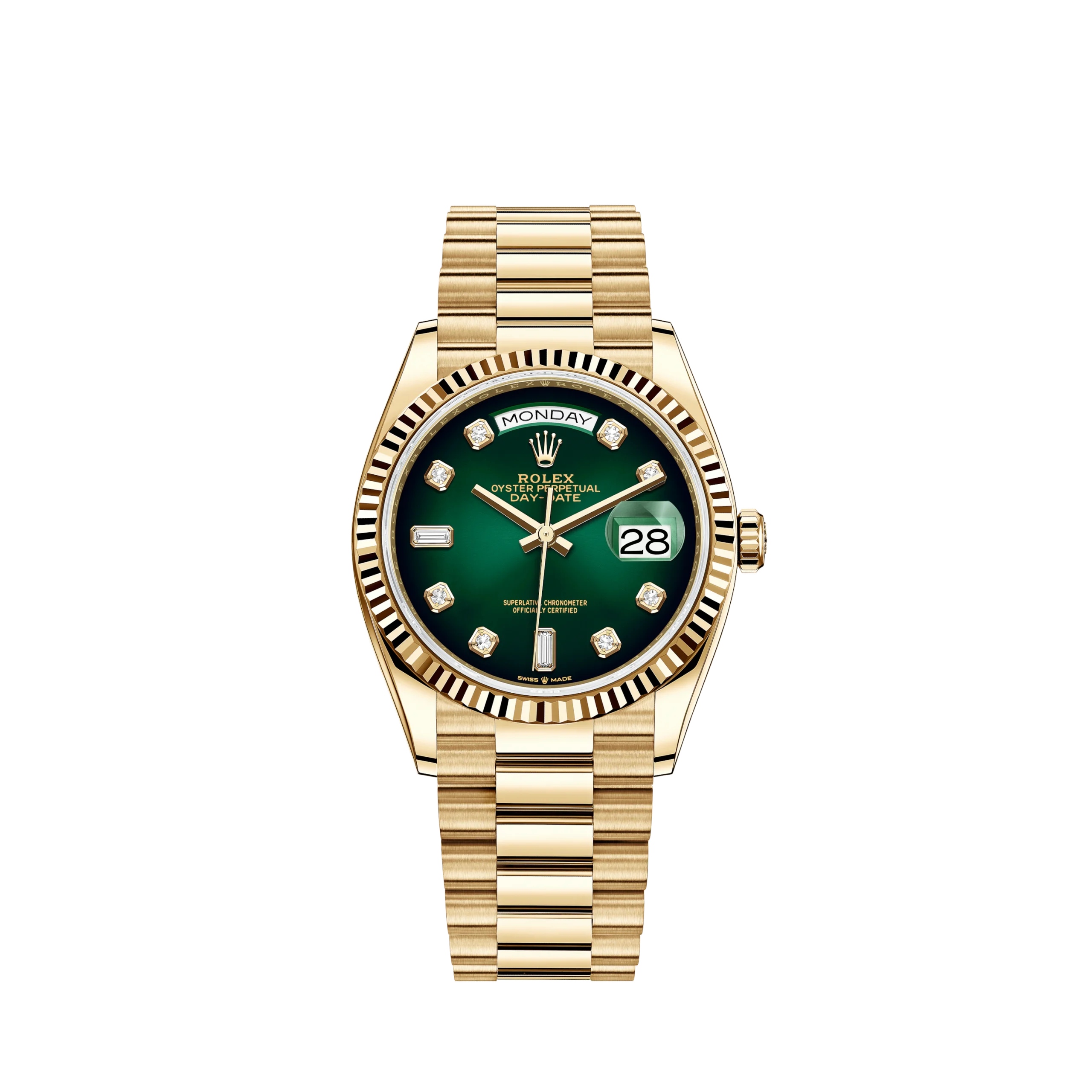 Dial Material: Bright surface, sunlight effect; 18K yellow gold set with 8 diamonds; 18K yellow gold set with two squares in diamonds at 6 and 9 o’clock; 18-carat yellow gold hands