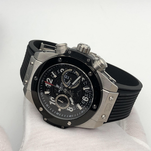 Bezel: Satin-coated and polished black ceramic with 6 H-shaped titanium screws
