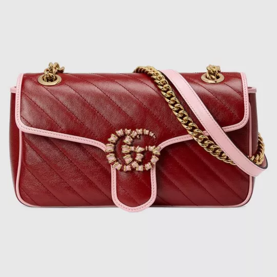 This GG Marmont series super mini handbag is made of red and pink quilted leather, showing the beauty of stunning contrast. The darling of the brand Gucci has opted for a series of brightly toned designs inspired by precious gemstones, minus a variety of outstanding styles from the Infinite Overture series. The iconic double-G accessory with enamel details adds to the overall appeal of the design.
